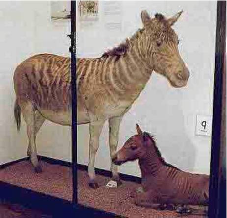 Проблемой зеброидов барон тоже занимался, но не с целью создать новую породу, а в надежде (как вскоре стало ясно – биологически несостоятельной) воскресить… кваггу, истребленный в XIX в. вид зебры с «полулошадиной» окраской. На фотографии – экспозиция из ротшильдовской зоологической коллекции, ныне входящей в Британский Музей естествознания: чучело взрослой квагги и жеребенка-зеброида «кваггообразной» масти