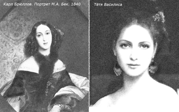 Такие лица можно увидеть на полотнах Карла Брюлова. В прошлом году мы с классом ездили на экскурсию в Ереван. И там, в национальной картинной галерее, я не могла поверить своим глазам. Передо мной висел портрет моей мамы, у которой почему-то вместо ее темно-русых с медным оттенком волос были почти черные кудри. Она сидела на фоне красного дивана, с тонким меховым шарфиком вокруг шеи, в платье из тяжелого синего бархата, со светлой накидкой, отороченной мехом. И ниже была надпись: Карл Брюллов. Портрет М. А. Бек. 1840. Теперь же я видела, практически, оригинал этой картины в лице своей тети. На ней даже была туника цвета индиго.