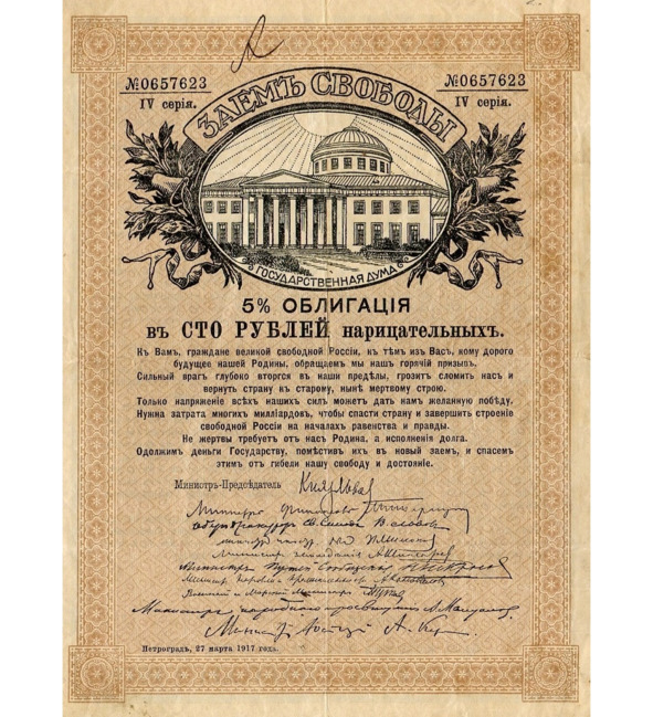 Облигация – по сути тот же самый кредит, просто носящий другое название. Облигация – документ, в котором написано, что государство выплатит держателю этого документа определённую сумму денег в определённую дату вместе с процентами. Правительство выпускает облигации для финансирования практически любых целей и продаёт их любому желающему – населению, бизнесу, другим государствам или своему же ЦБ. Ниже, к примеру, 5%-я облигация России 1917 года номиналом в 50 рублей, в которой правительство обращается к гражданам с просьбой одолжить деньги для финансирования войны и спасения страны.
