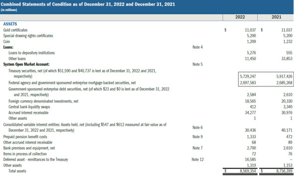 Ещё одной целью выкупа государственных облигаций было снижение долгосрочных ставок. Снижая ставку рефинансирования, ФРС снижает стоимость денег только на короткий срок, до одного года, поскольку именно на этот период Центральный банк кредитует коммерческие банки. В то время как ставки по долгосрочным кредитам могут оставаться высокими, это может отпугивать бизнес развиваться и строить новые производства. Поэтому, чтобы снизить долгосрочные ставки и оживить экономику, ФРС США скупает долгосрочные облигации и таким образом снижает ставку по ним. Покупая на рынке облигации в больших объёмах, она так или иначе влияет на цены этих облигаций, как слон в посудной лавке. ФРС осознанно покупает облигации, чтобы влиять на их цену. Дальше мы будем подробнее говорить о срочности облигаций и о том, как меняются ставки в зависимости от сроков. Ниже – активы Федеральной резервной системы США из её официальной отчётности, в которой видно, что она скупила $ 5,9 трлн облигаций США и $ 2,7 трлн ипотечных облигаций.