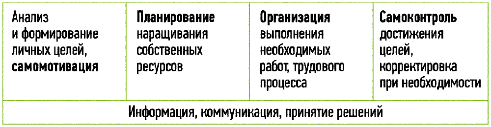 Функции самоменеджмента – самомотивация, планирование, реализация и организация, самоконтроль.