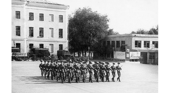 (на заднем плане слева – учебный корпус и техника связи, справа – курсантская столовая, а в просвете между ними виднеется забор автопарка)