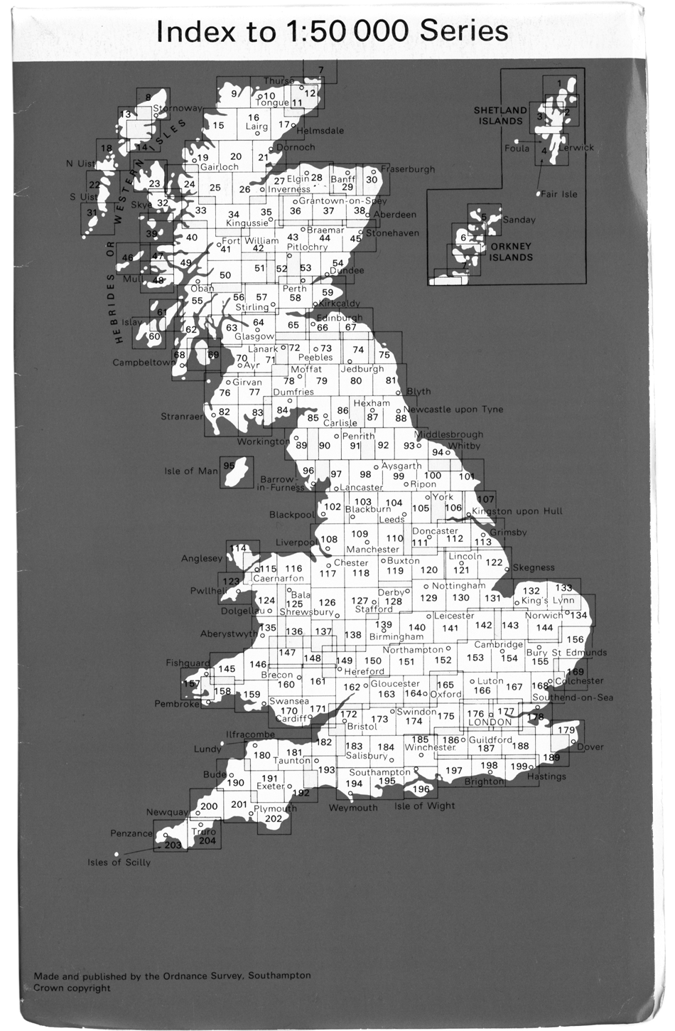 The 1:50 000 series (the ‘Landranger’ title only appeared in 1979) is the best range of general-use maps in the world. The whole of Great Britain is carved into 204 squares, each one a 40 × 40 km portrait of its patch of land. The variety is breathtaking: from map number 176 (West London), which is covered in the dense stipple of cheek-by-jowl population, covering the homes of perhaps 4-5 million people, to map number 31 (Barra & South Uist, Vatersay & Eriskay), where nine-tenths of the map is pale blue sea, and the rest just a few straggling islands of the Outer Hebrides, home to no more than a couple of hundred hardy souls.