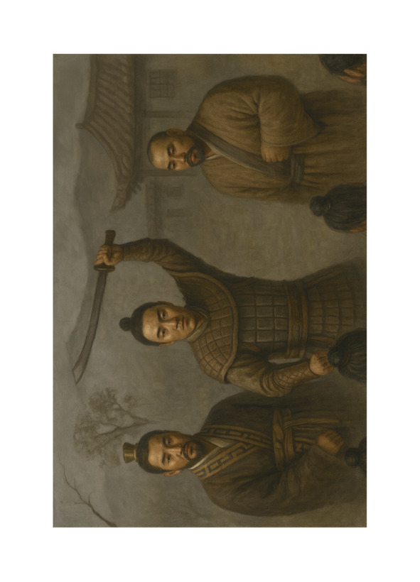 Позади, спотыкаясь, плелся Лу, шелковый советник, чьи шелка промокли от пота. Его лицо, бледное, как рисовая бумага, кривилось от боли. Он сполз с коня, его руки теребили ягодицы.