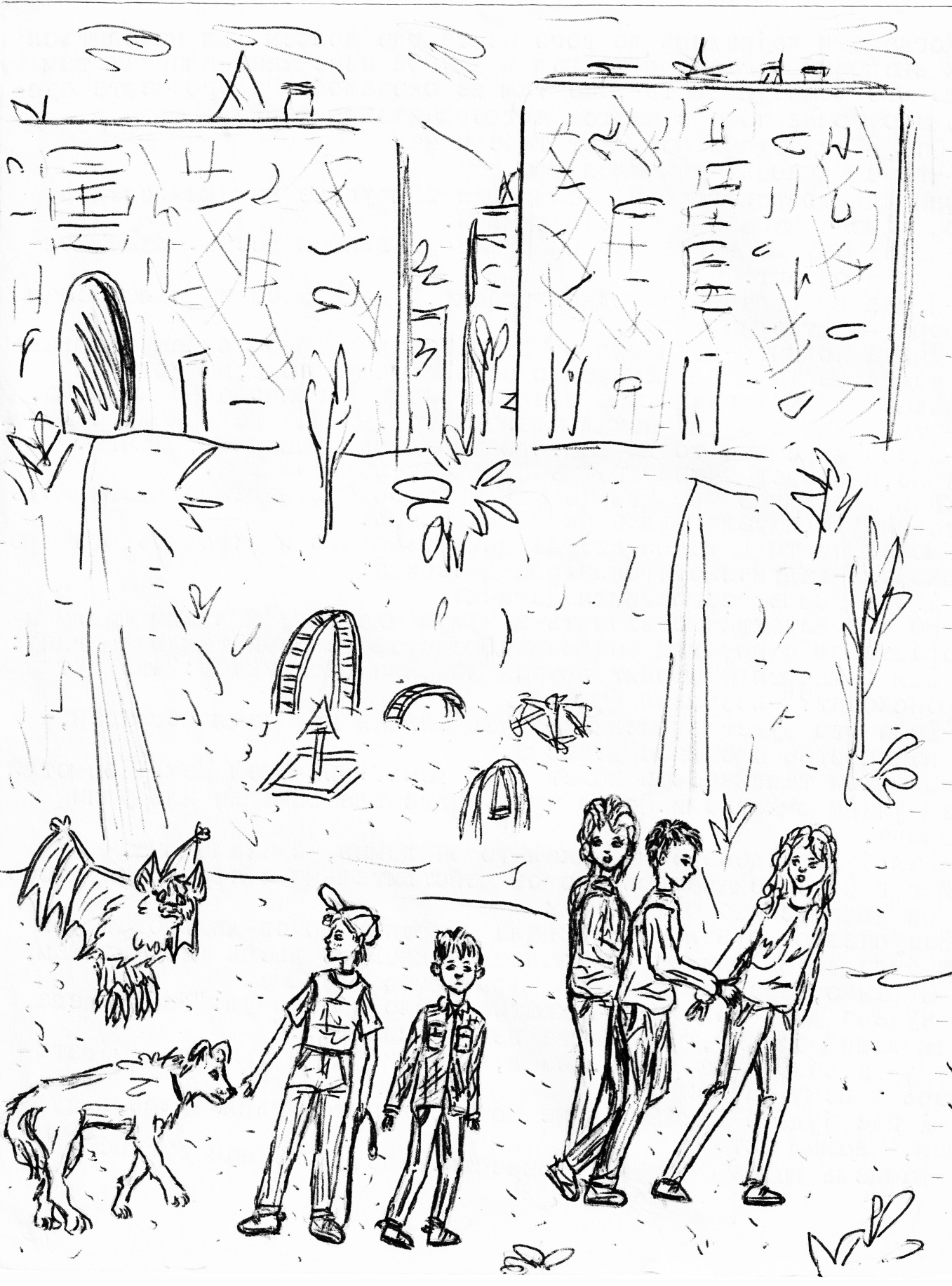 Ребята вот уже час бродили по серой мрачной улице 31-го века, и за все время им на пути не попалось ни одной живой души. У ног Генки бежала его собака Динка, которая тревожно оглядывалась по сторонам и обнюхивала родные, когда-то знакомые ей, места.