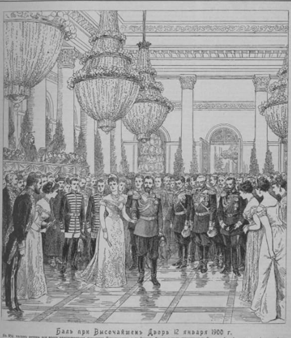 В половине десятого вечера придворный оркестр заиграл полонез из оперы «Жизнь за царя» и из внутренних покоев в предшествии новопожалованного обер-церемониймейстера графа В.А. Гендрикова и гофмейстерины статс-дамы светлейшей княгини М.М. Голицыной через Концертный зал вышли государь император в форме л.-гв. Казачьего полка в Андреевской ленте и государыня в белом шитом серебром бальном платье при Андреевской ленте и в ожерелье и диадеме из бриллиантов и жемчугов. За их величествами следовали государь наследник и великие князья с великими княгинями. Камер-пажи следовали за августейшими дамами, бывшими в белых шитых серебром платьях.