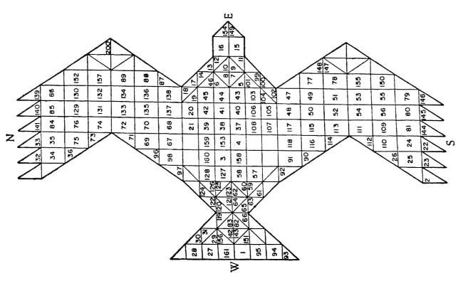 Алтарь Шьеначити возводят из тысячи кирпичей выверенной формы и точного размера в соответствии со сложной схемой, изображающей сокола. Рабочие кладут пять слоев по 200 кирпичей в каждом, повторяя специальную мантру и следуя пошаговым инструкциям. В основе ритуала лежит решение загадки: каждый слой должен повторять одну и ту же пространственную форму, но различаться внутренней конфигурацией[69]. Соколиный алтарь следует обращать на восток, знаменуя предстоящий символический полет воссозданного бога к восходящему солнцу – здесь мы видим уникальный пример божественного перевоплощения средствами геометрии.