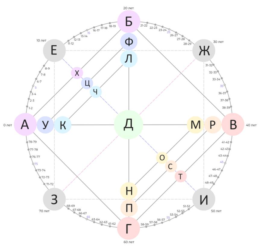Например: в центре схемы стоит 6 энергия, а на родовых крупных позициях стоят – (Е) 22, (Ж) 20, (З) 13, (И) 11 энергии.