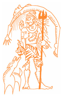 Шива в образе свирепого Бхайравы, несущего труп Сати или Вишваксены (Канкала-мурти), череп Брахмы или Дакши (Капалика-мурти), просящего подаяние со своей собакой (Бхикшатана-мурти)