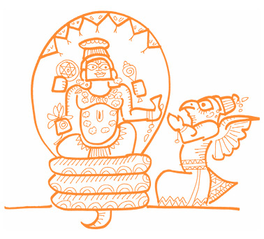 Гаруда поклоняется Вишну, сидящему на кольцах космического змея Ади Ананта Шеши