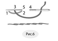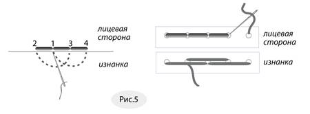 Выполняется методом "назад иголка". Игла выходит на лицевую сторону в точке 1 и уходит на изнаночную в точке 2. Затем выходит с изнанки в точке 3 и возвращается по лицевой стороне в точку 1 и т. д. (Рис.5). Длинные стежки лучше разбивать на небольшие, длиной 1-1,5 см, при этом четко следуя рисунку.