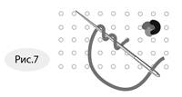 Выведите иглу с изнаночной на лицевую сторону канвы. Обвейте нить вокруг острия иголки (один раз – для узелка с одинарной навивкой, два раза – для узелка с двойной навивкой). Натягивая нитку, выведите острие иглы на изнаночную сторону, отступив от выходящей нитки 1 -2 мм. Аккуратно проведите иглу на изнаночную сторону, одновременно прижимая узелок большим пальцем. Затяните узелок (Рис.7).