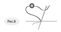 Вденьте нитку в иголку и выведите на лицевую сторону вышивки. Нанижите бусину на иголку и спустите ее по нитке до самой канвы. Выведите иглу на изнанку в той же самой точке, чтобы закрепить бусину на месте (Рис.8).