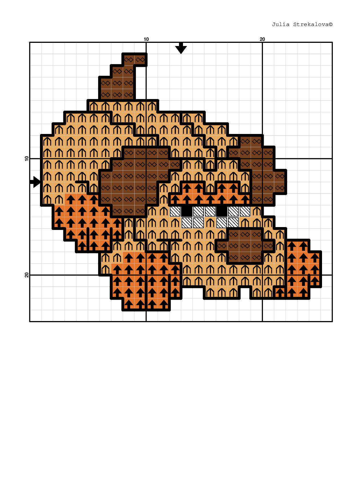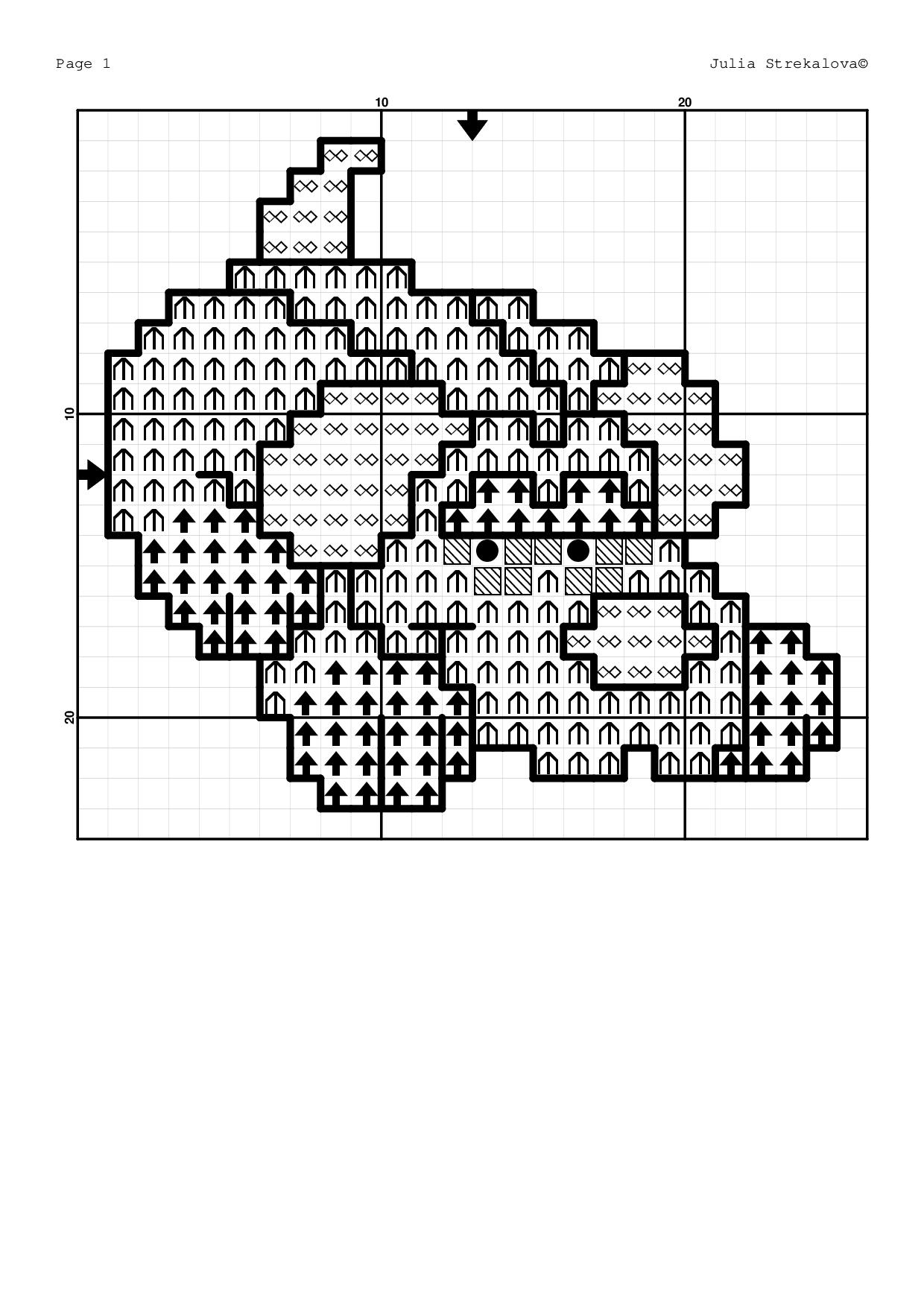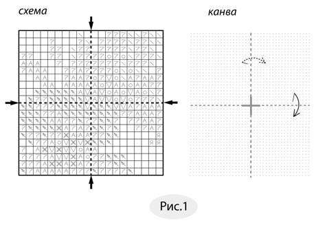 Данная инструкция по вышиванию крестом поможет вам понять, как правильно вышивать по схеме и с чего начать. Определите центр вышивки, сложив канву вчетверо. Он соответствует центру схемы, который определяется двумя пересекающимися линиями со стрелками на концах. Обратите внимание, что схема не отражает готового размера вышивки. Клеточки на схеме соответствуют квадратикам на канве. Пустые клеточки обозначают не вышиваемые участки (Рис.1).