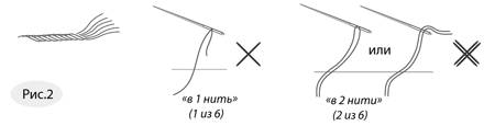 Пасма мулине состоит из 6 нитей. Чтобы готовая работа не отличалась от фото на обложке набора и во избежание недостачи мулине, используйте строго указанное в схеме набора количество нитей. На Рис.2 показано, что обозначает "вышивка в 1 нить" и "вышивка в 2 нити".