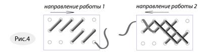 Вышивку лучше вести горизонтальными рядами. Сначала накладывайте нижние стежки, двигаясь в одном направлении, затем, возвращаясь, верхние (Рис.4). Чтобы вышивка была аккуратной, соблюдайте одинаковый порядок наложения верхних и нижних стежков. Натяжение нити должно быть одинаковым, в меру свободным, чтобы крестик получался объемным.