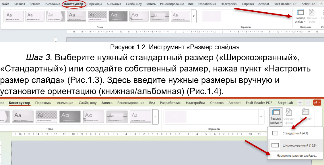 Шаг 3. Выберите нужный стандартный размер («Широкоэкранный», «Стандартный») или создайте собственный размер, нажав пункт «Настроить размер слайда» (Рис.1.3). Здесь введите нужные размеры вручную и установите ориентацию (книжная/альбомная) (Рис.1.4).