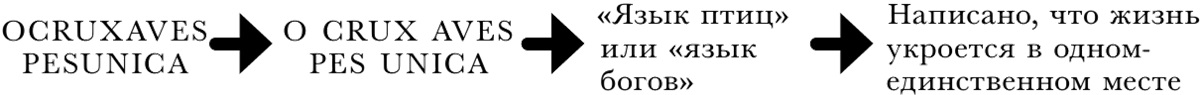 В заключительной части «Тайны соборов», посвященной циклическому кресту в Анде232, Фулканелли разбирает две надписи, сделанные на кресте. Одна из них традиционная «INRI – Iesus Nazarenus Rex Iudaorum», которую Фулканелли трактует, основываясь на изначальном допущении тайного смысла символизма готического искусства, как «Igne Natura Renovatur Integra»233. Вторую надпись на кресте автор тоже подвергает широкой интерпретации, пользуясь тем, что слова на кресте не разделены пробелами. «OCRUXAVES PESUNICA» Фулканелли трактует не традиционным образом, как «o crux ave spes unica»234, а герметически – «o crux aves pes unica»235, набор несвязанных слов, требующий дополнительного истолкования, которое и совершает автор, опираясь на герметическую литературу по дешифровке «языка птиц» или «языка богов»236, в итоге получая фразу, полностью соответствующую его алхимической теории: «Написано, что жизнь укроется в одном-единственном месте». Неэкономичность этого толкования легко можно проиллюстрировать схемой, приведенной ниже: