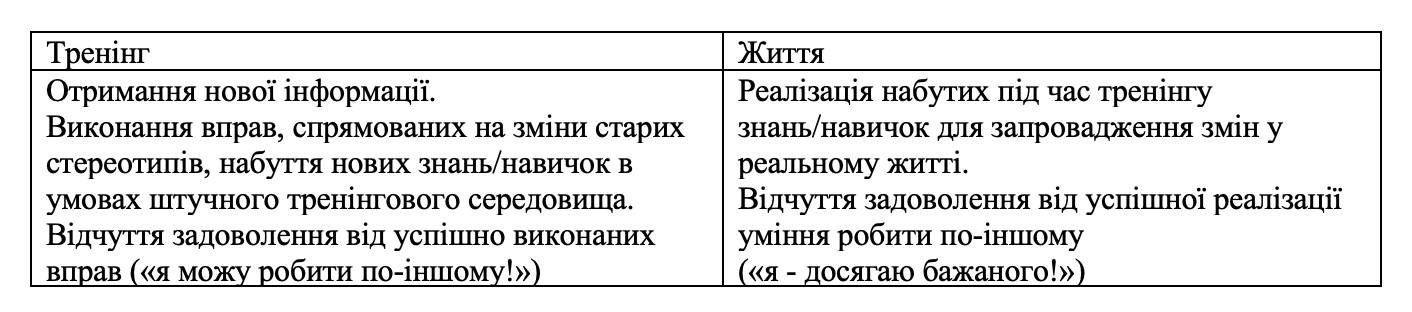 інформування та набуття учасниками тренінгу нових навичок та умінь;