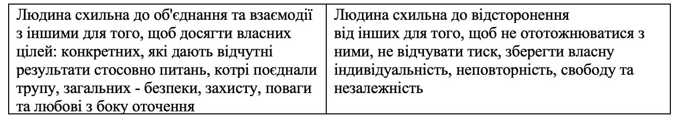 Для кожної людини ситуація потрапляння в будь-яку групу є, певною мірою, хвилюючою, тому що людина в групі прагне одночасно реалізувати два взаємно протилежні комплекси міркувань, психологічних установок: з одного боку, вона природно прагне до об'єднання з собі подібними, а з іншого – так само природно, до виокремлення себе серед інших.