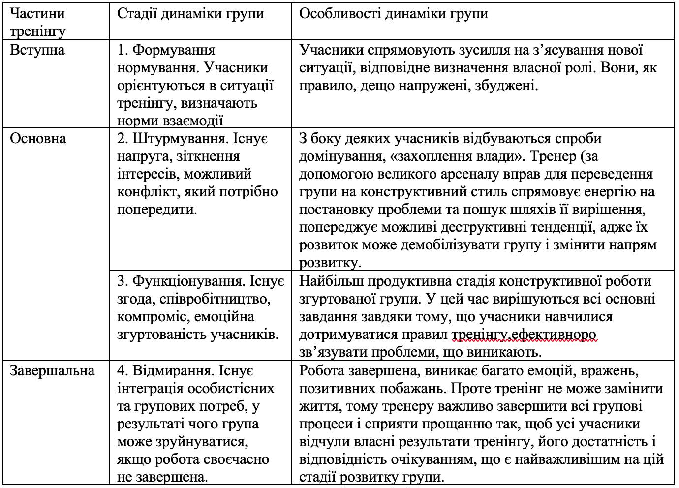 Групи, так само як люди, проходять певний життєвий шлях. Цей процес розвитку включає всі зміни, які відбуваються з індивідом та групою від початку роботи до завершення тренінгу. Успішна робота групи можлива лише за умови знаходження балансу між напругою та згуртованістю учасників (див табл. 2). Надмірний рівень напруги породжує конфлікти, а надмірна згуртованість заважає здатності групи до конструктивного розвитку в напрямі досягнення мети тренінгу. Члени надмірно згуртованої групи виявляються задоволеними тренінговим спілкуванням, але група в цьому разі «вмирає» – не може знаходити ефективні способи вирішення тренінгових завдань, організувати для цього зіткнення учасників різних точок зору і досвіду.