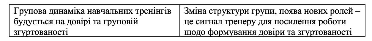ефективність розвитку процесів групової динаміки у навчальних тренінгах значною мірою залежить від рівня довіри та згуртованості учасників групи;