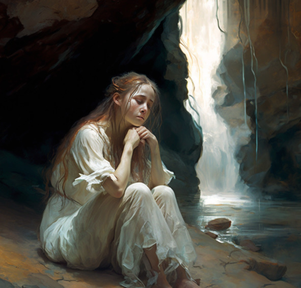 На девице сарафан, словно из дерюги,Синяки от кандалов, закрывают руки.Ратимир скорей плащом, стан прикрыл девицы,Родомир дал в чарке квас, чтобы ей напиться.Гномы козий сыр, и хлеб, достают скорее,Из плащей кладут постель, прямо на земле ей.Пригубила хлебный квас, закусила сыром,И упала на плащи, видимо, без силы.Что же, войны подождут, тормошить с расспросом, Смотрят, Агни в круг плащей, рассыпает просо.Зажигает три свечи, шепчет заклинанья,И под сводом темных глыб, вдруг зажглось сиянье.Агни:«Расскажи нам дух огня, что тут за девица,Кто оставил её здесь, в мрачной тьме таится?»И над водами ручья, поплыли картины,Как два волка шли сквозь лес, за отряда тылом.Как в пещеры вслед вошли, тенью прикрываясь,Как ушёл от них отряд, в тьме пещер теряясь.Но не волки были то, волкодлаки были,И у каменной тропы, в сумрак облик скрыли.