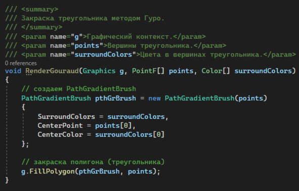 В качестве практической вставки посмотрим, как закрасить треугольник в соответствии с методом Гуро. В графической библиотеке GDI+ присутствует необходимый функционал, чтобы линейно интерполировать цвета между тремя вершинами. (см. листинг ниже)