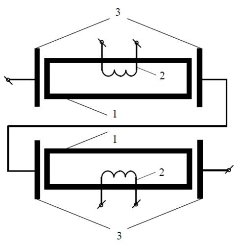 Рис. 2. Установка Денисова. 1 – вакуумные колбы; 2 – спирали накала; 3 – разгоняющие электроды.
