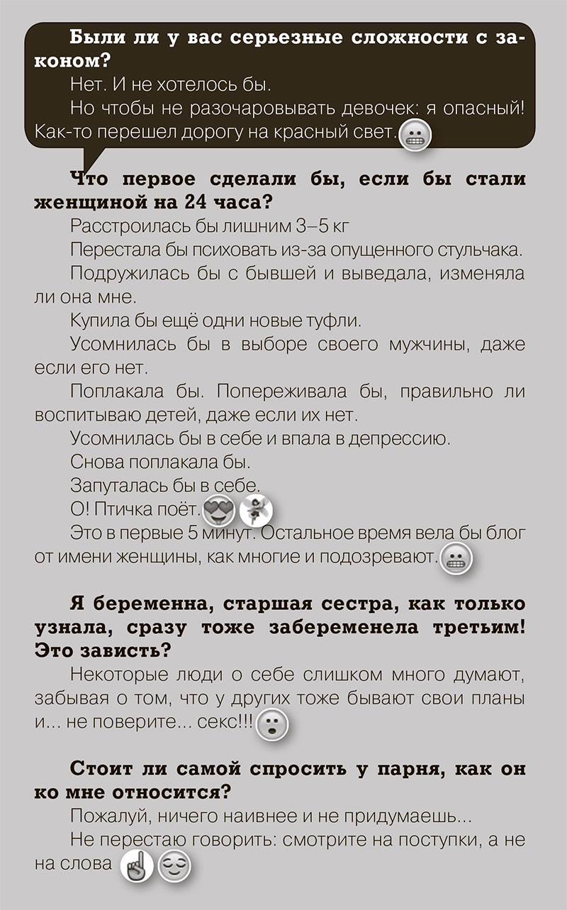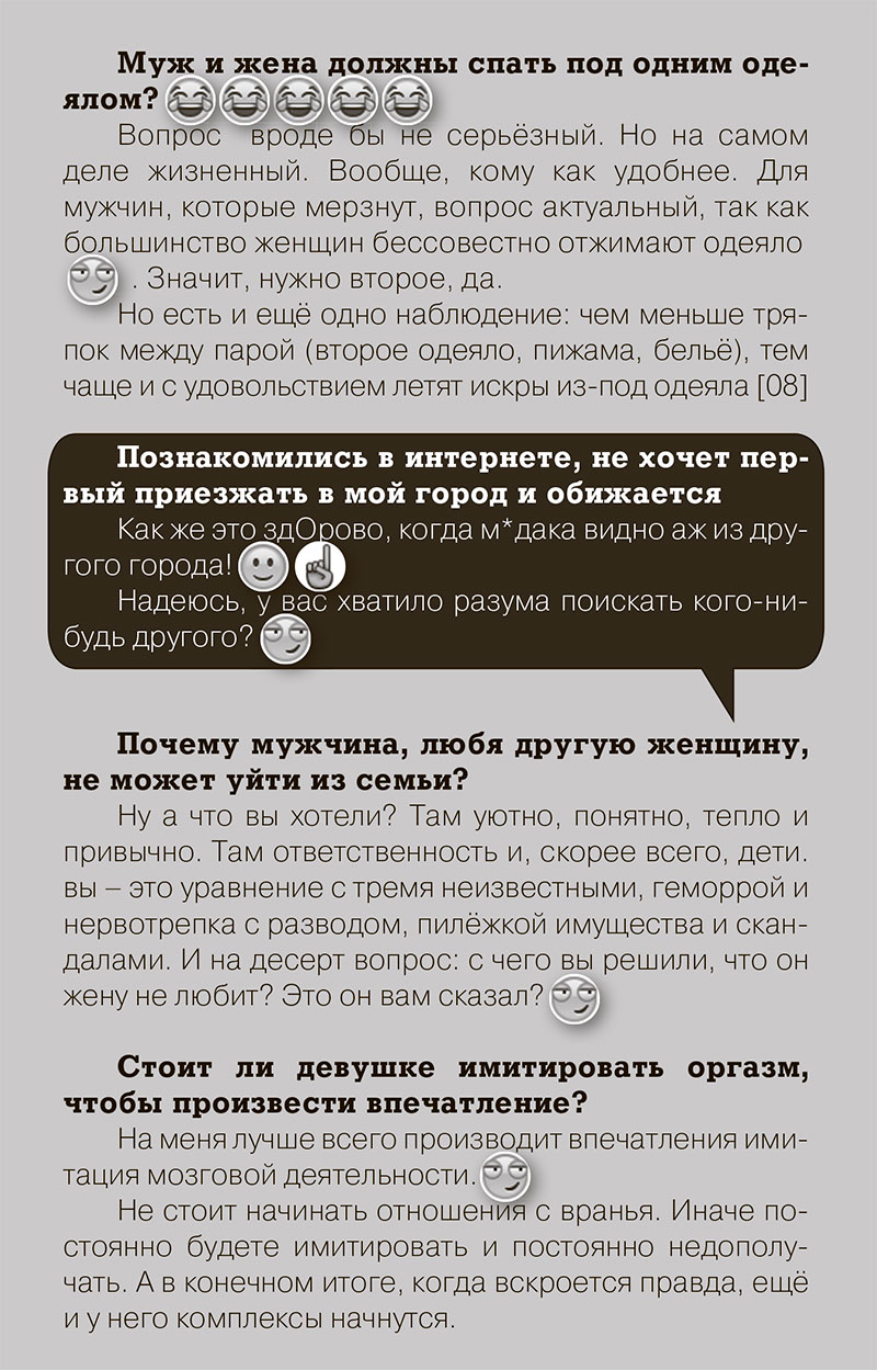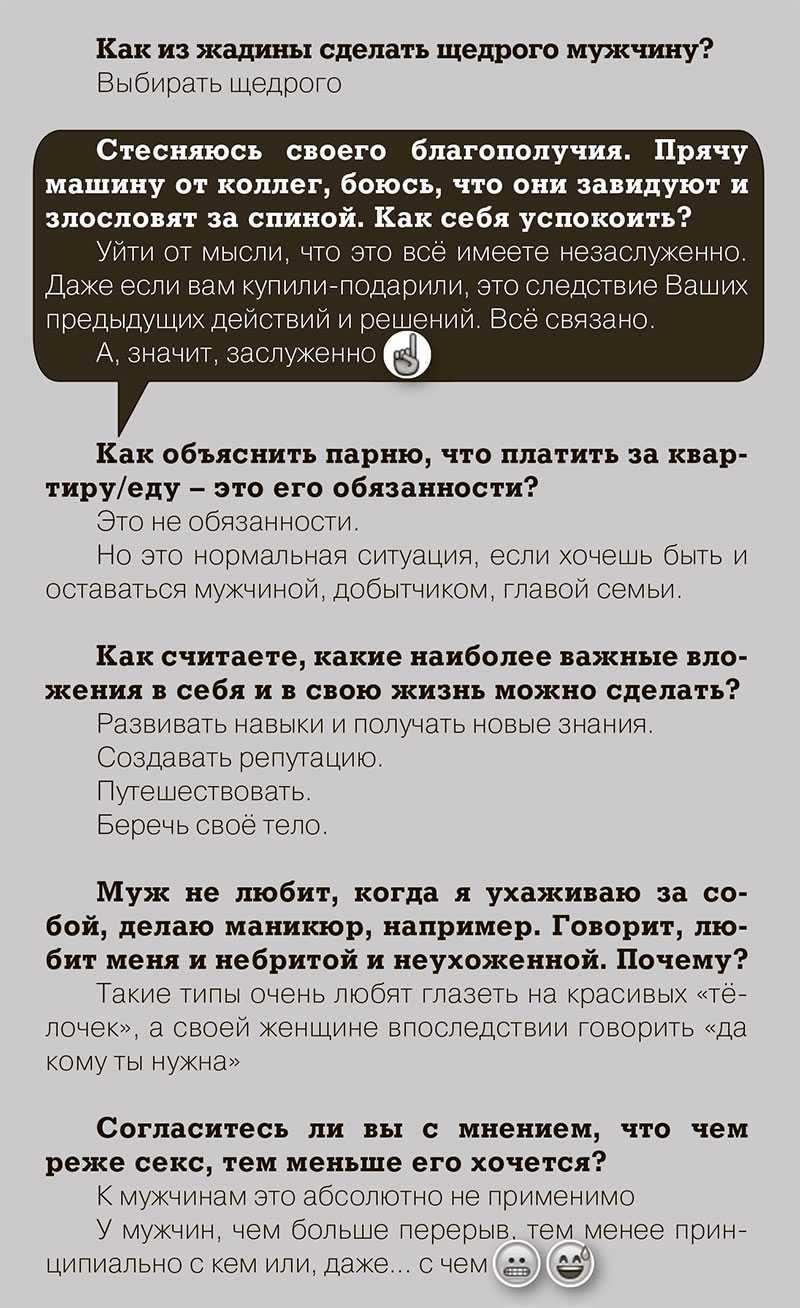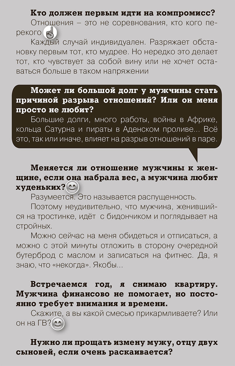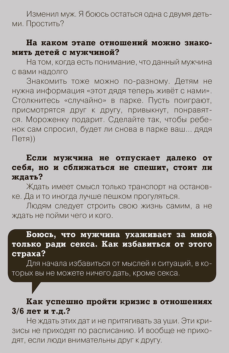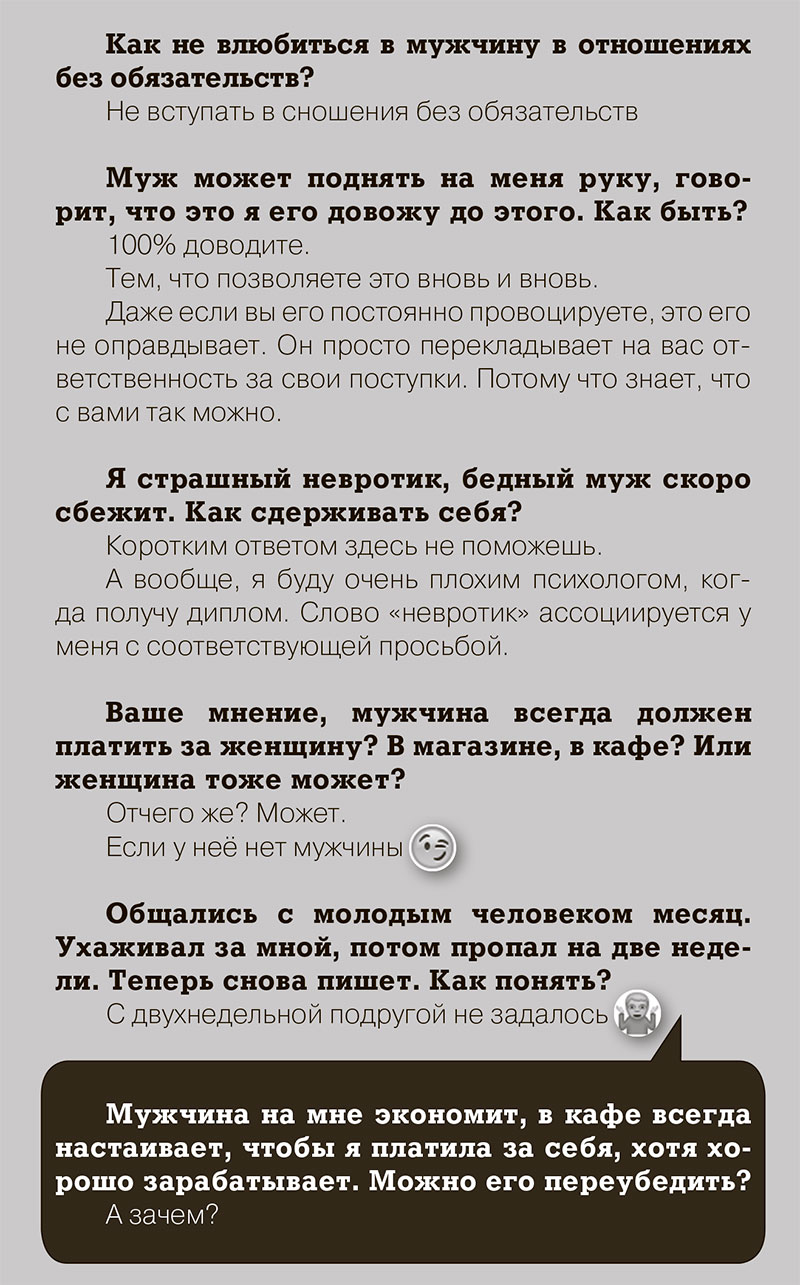 Тем не менее, я искренне верю, что, ознакомившись с этой главой книги, вы не будете бросаться в омут с головой и сможете избежать серьёзных отношений и совместной жизни с подобного рода человеком. Потому что такие люди, как правило, довольно быстро раскрываются в мелочах. Предупреждён – значит вооружён. Ну а мне остаётся лишь надеяться, что такие мужчины будут менее востребованы, и им придётся либо поработать над своим мышлением, либо не размножаться и вымереть как вид. ☺