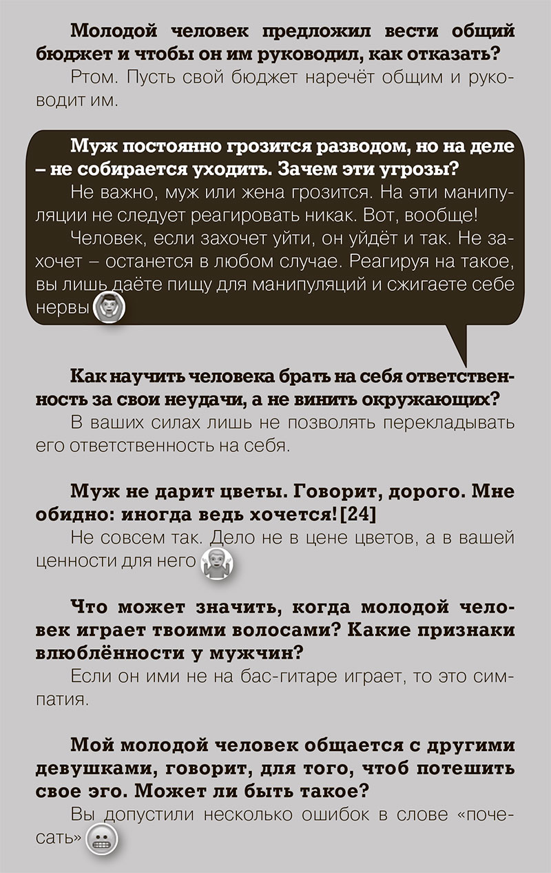 Прошу обратить внимание, что лидерство мужчины в паре не подразумевает отсутствие взаимоуважения и компромиссов. Конечно же, мужчине обязательно следует прислушиваться к своей женщине и интересоваться её мыслями и желаниями, разумно идти ей навстречу! Но последнее слово в принятии важнейших решений всегда должно быть за мужчиной. Как, опять же, и ответственность за эти решения!