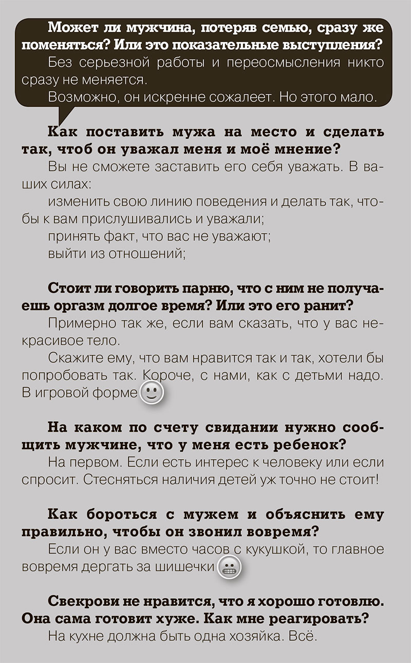 Я уже чувствую, как вы хотите мне возразить про равноправие и взаимоуважение в паре, и что мои слова «попахивают» неприкрытым сексизмом. Знаю, меня пытаются иногда обвинить в этом те, кто видит ситуацию в отношениях по-другому. Возьму на себя смелость заявить, что жизнь подтвердит мои слова и всё расставит по своим местам.
