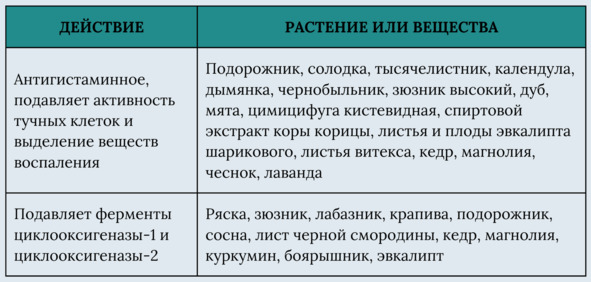 Елена Владимировна Корсун в своих книгах по фитотерапии упоминает растения, которые обладают противоаллергическими свойствами и снижают активность гистамина по данным исследований [41] (см. табл. на с. 43).