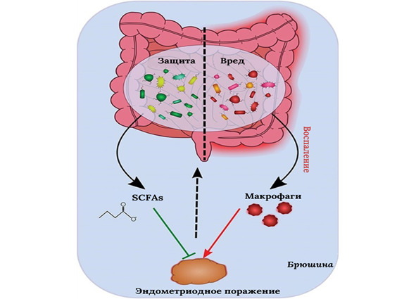 Картинка из статьи о микробиоте и эндометриозе, опубликованная в журнале Биология репродукции показывает связь микробиоты, макрофагов, которые выделяют гистамин и воспаления [46] (см. рис. на с. 46).