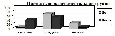 Высокий уровень развития в экспериментальной группе выявлен у 65%, в контрольной группе у 40%.