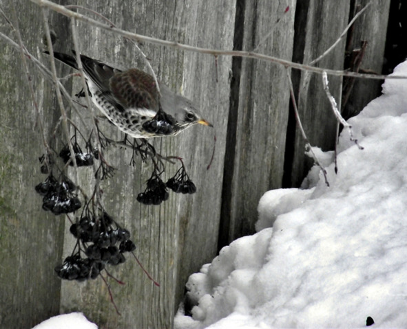 Дрозд-рябинник прилетел, На рябинку нашу сел: «Много ягод здесь осталось. Поживу я рядом малость. Голодно зимой холодной. А я с рябиной черноплодной.
