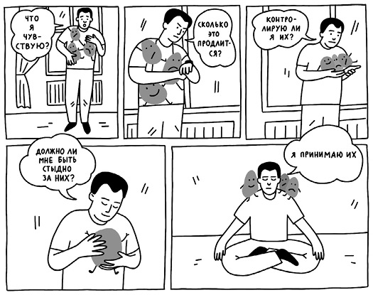 Контроль эмоции возможен, но это не прямое управление. У нас нет рычажка, с помощью которого мы можем напрямую добавить или убавить эмоцию. В наших силах отчасти контролировать свои мысли по поводу ситуации, контролировать свое поведение, физиологию, т. е. другие компоненты эмоции, но не само переживание. Само переживание может уменьшиться в результате наших действий, а может не уменьшиться. Но это не страшно, потому что это просто ощущение, с которым мы можем остаться. В этом нам помогают практики осознанности. Я приведу несколько таких техник в конце этой главы.