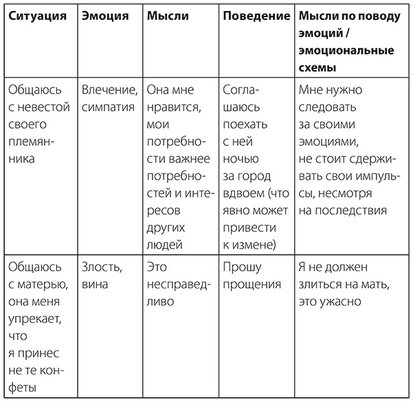 Эмоциональные схемы – это наши убеждения, касающиеся эмоций. Например: «Эмоция длится долго и никогда не закончится, если что-нибудь с ней не сделать». Или: «Я могу выражать свои эмоции другим способом, безопасным для себя».