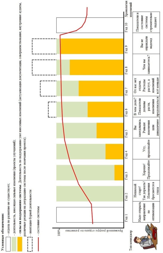 3. Если вы не хотите выполнять пункт 2, то нужно примириться с тем, что ваш отдел развития рано или поздно придёт в фазу «9-го года», как на рисунке. Они будут вести множество рутинных задач для того, чтобы система не деградировала к первоначальному состоянию.