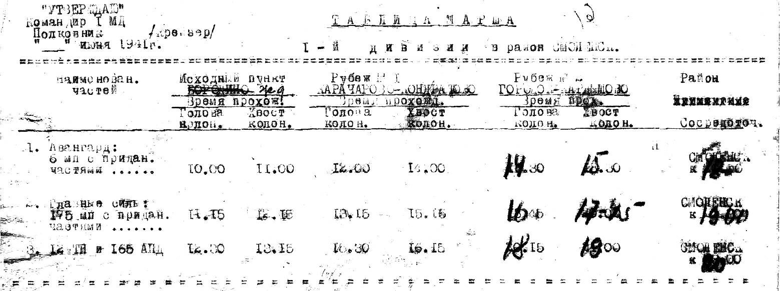 В подписанной начальником 1-го отделения штаба дивизии майором В.Н. Ратнером таблице марша41 проведён расчёт времени движения.