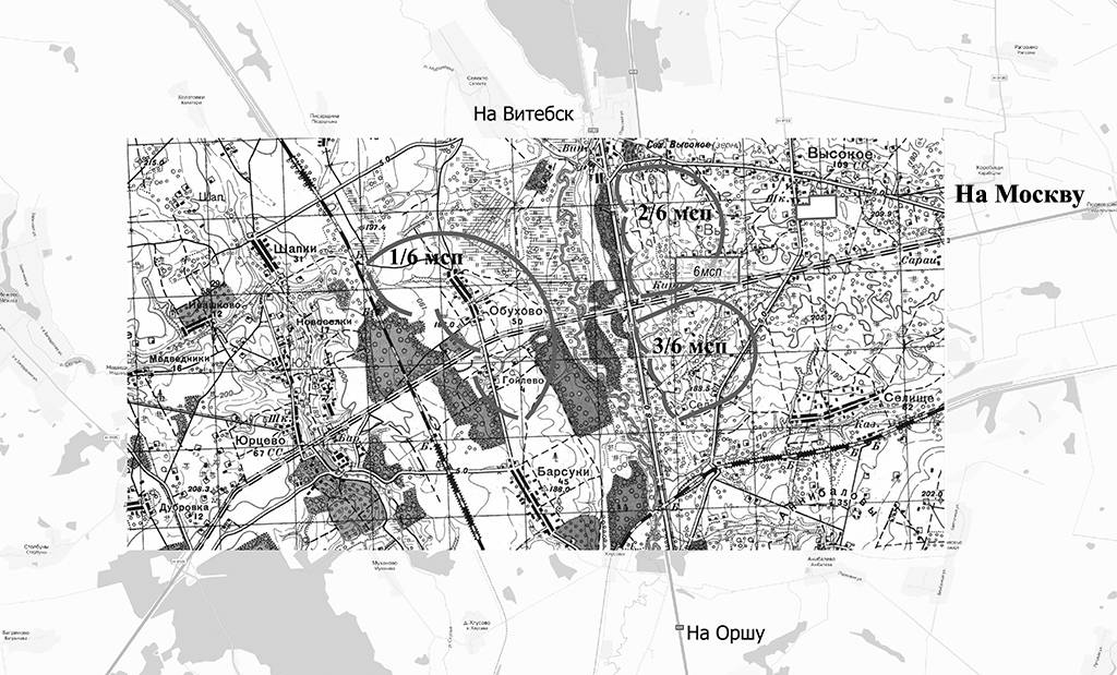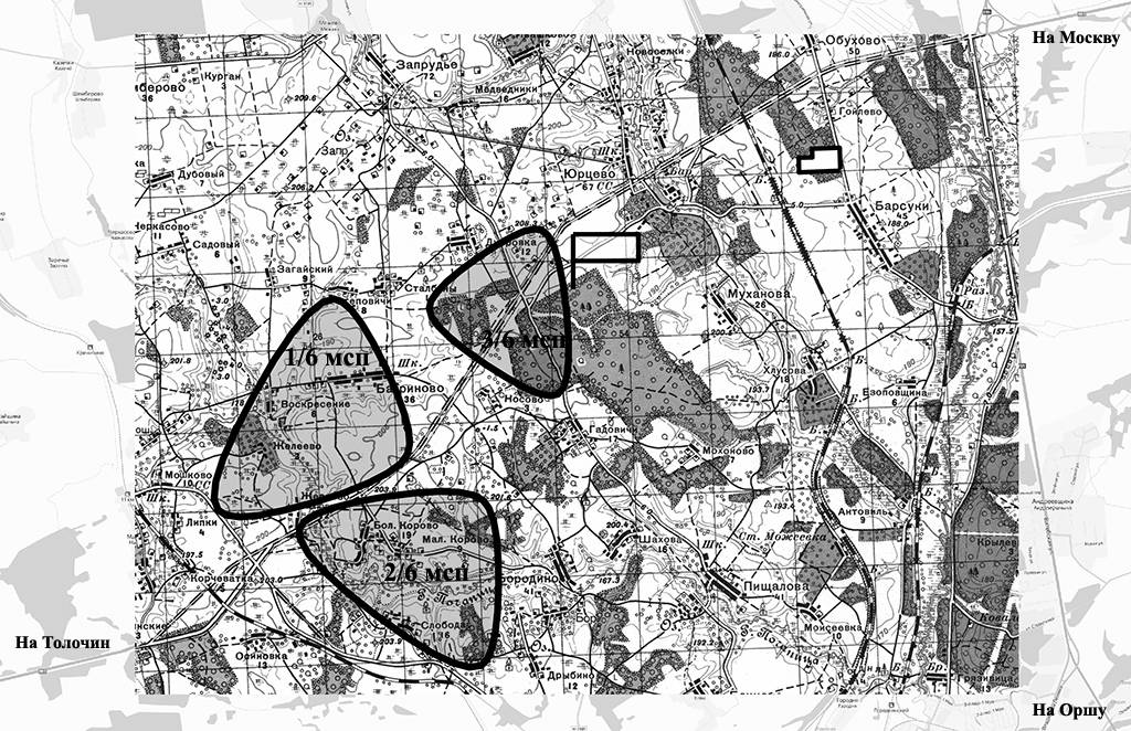 б) 2-й б-н занимает: правый фланг – совхоз Высокое, левый фланг – стык шоссе Москва – Витебск – Орша и перекрёсток троп сев-вост. 200 мтр выс.