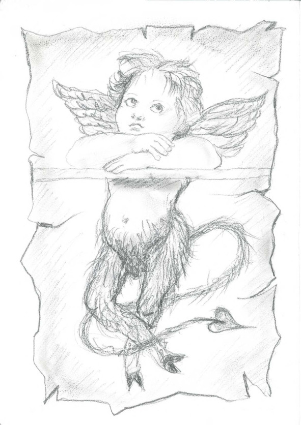 Ангелочек прилетел домой, повесил на гвоздь лук, бросил на полупустой колчан и подойдя к зеркалу, стащил кучерявый парик, надев его на деревянный манекен. Потом, морщась от боли, отодрал длинные накладные ресницы и, густо намазавшись гигиеническим молочком, начал снимать с лица грим. Исчезли розовые, светящиеся изнутри щечки, появились большие одутловатые мешки под глазами, проявилась землистая, увядшая кожа. На столик легли вынутые линзы, придававшие глазам с красными прожилками голубизну. Ангелочек зачем-то показал себе в зеркало язык с белым налетом и, сняв с гнилых зубов фарфоровые коронки, стал отстегивать крылья, из-под которых исходил сильный запах пота. Хотелось скорей распрямить большой, прижатый к телу хвост и побыстрей скинуть бутафорские тапочки в виде детской ножки, чтобы с удовольствием пошевелить затекшими копытцами.