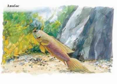 АНАБА́СЫ(ползуны), рыбы сем. ползуновых, или лабиринтовых. Обитают в стоячих и медленно текущих пресных водоёмах Юго-Восточной Азии и Южной Африки, иногда встречаются в солоноватой воде мангровых зарослей. Все анабасы имеют лабиринтовый орган – сложную систему тончайших костных пластинок, покрытых слизистой оболочкой с многочисленными кровеносными сосудами. Расположен он в наджаберной полости; даёт рыбам возможность жить в воде, бедной кислородом, и использовать атмосферный кислород для дыхания, заглатывая его периодически с поверхности воды. Это позволяет рыбам некоторое время находиться вне воды и даже с помощью плавников переползать из водоёма в водоём во время дождя или по росе (отсюда название – ползуны). Лабиринтовым рыбам недостаточно жаберного дыхания, и они не могут обходиться без воздуха.