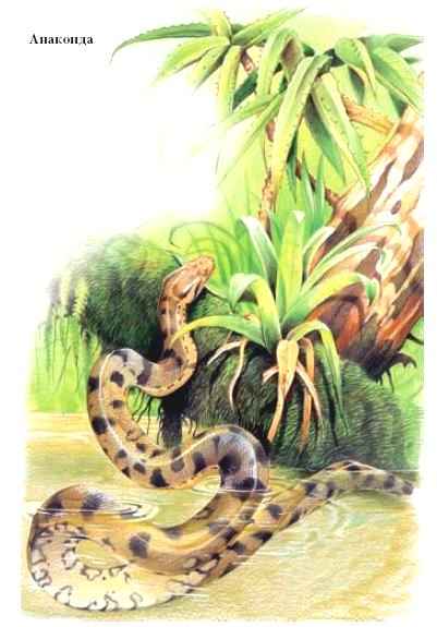 АНАКО́НДА(обыкновенная анаконда), змея рода удавов сем. ложноногих. Наряду с сетчатым питоном относится к самым крупным пресмыкающимся, её длина может достигать 11 м, но обычно не превышает 5—8 м. Окраска оливково-серая, на спине 2 ряда бурых пятен, по бокам – светлые мелкие пятна с чёрной окантовкой. Населяет водоёмы бассейна р. Амазонки, предпочитая заросшие, заболоченные мелководные заводи, старицы и озёра, где малозаметна в серо-зелёной воде. Затаившись среди плавающих листьев и пучков водорослей, змея подстерегает добычу. Схватив жертву острыми зубами, загнутыми внутрь, и удушив в воде, заглатывает её. Молодые анаконды охотятся на рыб, лягушек, черепах, кайманов и др., взрослые змеи заглатывают мелких копытных, других зверьков, а также птиц (от мелких водоплавающих до куриных и индеек). Объект промысла туземного населения (добывают ради мяса, кожи, жира). Становится редким видом прежде всего из-за осушения местообитаний. Анаконд разводят в ряде зоопарков. В неволе обычно живут до 12 лет.