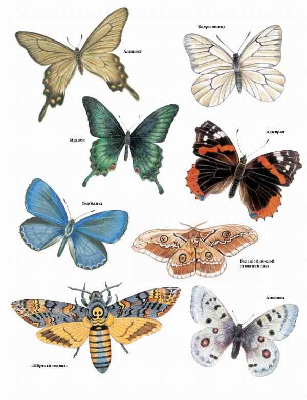 Отряд чешуекрылых делится на 2 группы: равнокрылых и разнокрылых, к последним относится большинство бабочек. Это невзрачные моли, вредящие в садах листовёртки (напр., яблонная плодожорка), часто яркие и пёстрые огнёвки, крупные павлиноглазки, ночные бабочки (бражники и совки), пёстроокрашенные пяденицы, нимфалиды (крапивница, траурница, репейница, перламутровка), белянки (капустницы, лимонницы), парусники (аполлон, махаон) и многие другие.