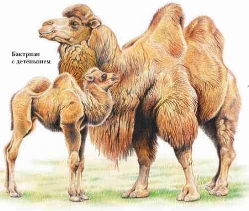 БАКТРИА́Н(двугорбый верблюд), млекопитающее рода верблюдов. Крупное животное с длинной шеей и двумя большими жировыми горбами на спине. Дл. тела 2,5—3,6 м, выс. в холке 1,8—2,1 м, дл. хвоста 50—58 см, масса 450—690 кг. Одомашнен в глубокой древности. Диких бактрианов осталось очень мало (ок. 300 особей), обитают они на юго-западе Монголии, в Заалтайской Гоби. Держатся группами (самец, несколько самок и детёныши). Половая зрелость наступает у самок в 3 года, у самцов в 5 лет. Размножаются в январе – феврале. Самцы дерутся насмерть из-за самок. Одомашненных бактрианов широко используют в хозяйственных целях в Монголии, Северном Китае, Средней Азии. Шерсть хорошего качества (с одного верблюда настригают до 13 кг).