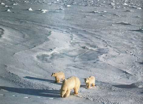 Для Арктики характерно явление полярного дня и полярной ночи, поэтому солнечная радиация поступает крайне неравномерно. Среднегодовая тем-ра повсюду в Арктике отрицательна, а ср. тем-ры летних месяцев близки к 0 °C. Зимой тем-ра понижается до –25 °C в приатлантической части Сев. Ледовитого океана, до –35 °C в морях Сибирского и Канадского регионов и до –50 °C в центр. части Гренландии. Осадки (150–350 мм в год) выпадают преимущественно в виде снега, на море постоянно присутствуют морские льды. На суше господствуют многолетнемёрзлые породы, а в них подземные льды. На значительной части Гренландии и на многих арктических о-вах лежат ледниковые покровы, их общая пл. ок. 2 млн. км². Плавучие морские льды занимают ок. 11 млн. км² зимой и ок. 8 млн. км² летом. Толщина однолетних льдов 0,1–1,8 м, многолетних – 3–4 м. Изредка встречаются айсберги. Для судоходства в Арктике большое значение имеет Сев. морской путь.