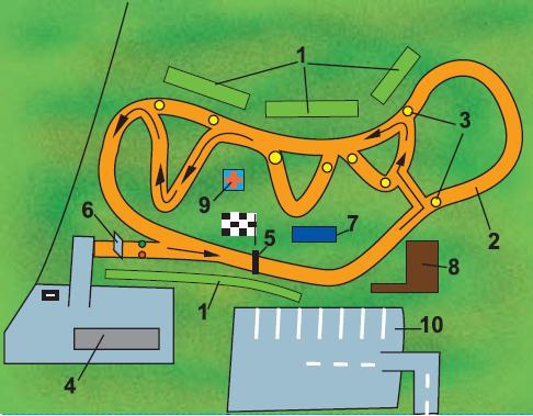 1 – трибуны; 2 – трасса; 3 – съёмное ограждение; 4 – закрытый парк; 5 – финиш; 6 – стартовая зона; 7 – спасательная бригада; 8 – техпомощь; 9 – медпункт; 10 – стоянка автотранспорта