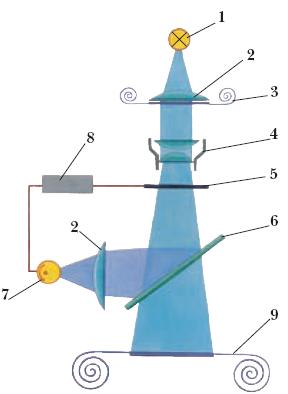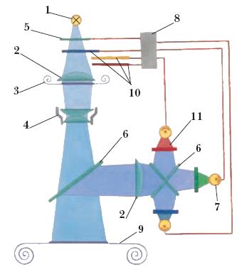 1 – источник света (электрическая лампа); 2 – конденсор; 3 – фотоплёнка; 4 – объектив; 5 – фотозатвор; 6 – полупрозрачное зеркало; 7 – фотоэлемент; 8 – устройство управления фотозатвором и для цветной печати корректирующими светофильтрами; 9 – рулонная бумага; 10 – корректирующие светофильтры; 11 – цветоделительные светофильтры