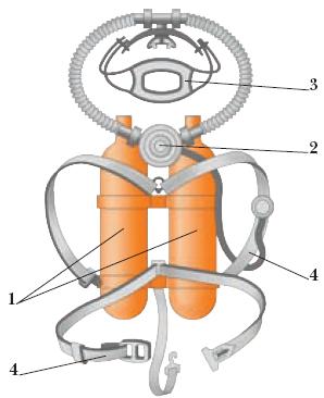 1 – баллоны с воздухом; 2 – дыхательный автомат; 3 – оголовье; 4 – ремни крепления